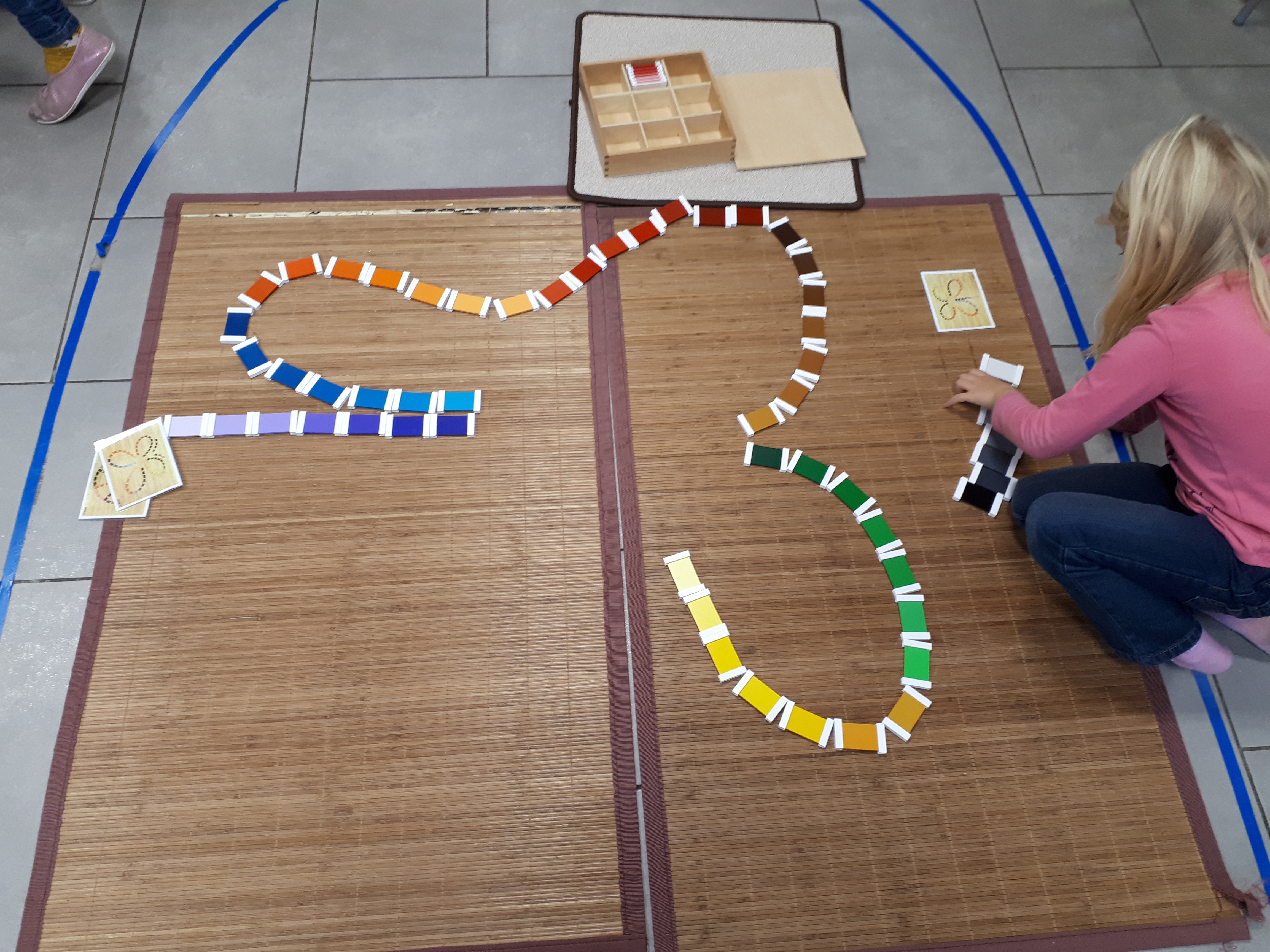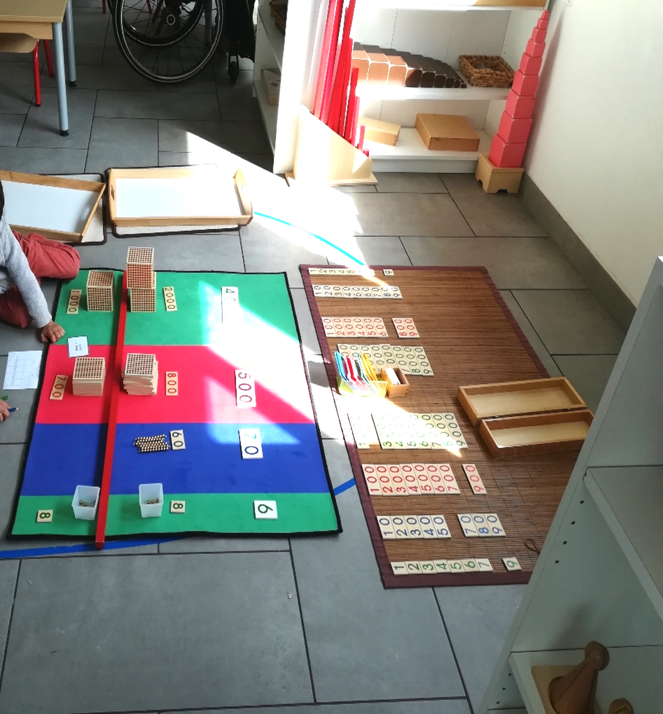 L’enfant est libre dans son corps : il peut travailler assis à une table, ou au sol sur un tapis qui délimite son espace de travail. Cette liberté renforce son confort, sa concentration et son autonomie.